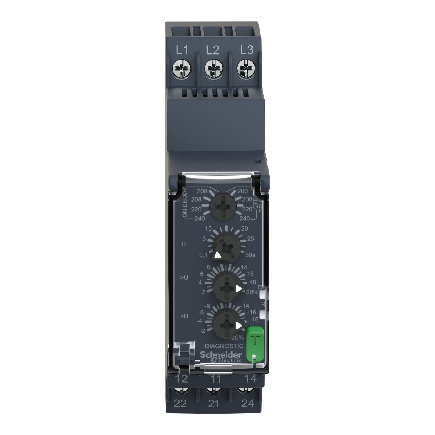 Harmony Control. Dieses Netzüberwachungsrelais überwacht Drehstromnetze (200-240 VAC) auf Phasenfolge, Phasenausfall, Unter- und Überspannung. Zur Meldung sind zwei Relaiswechsler vorhanden, die bis 8 A belastbar ist. Für die Unter- und Überspannung ist jeweils ein Grenzwert (-20--2%/+2-+20%) und für den Ausgang ist eine Ansprech- oder Abfallverzögerung einstellbar. Die Einstellungen erfolgen über Bedienelemente in der Front, die unter einer Klarsichtabdeckung gegen Veränderungen geschützt werden können. Mit einem beleuchteten Skalenpfeil läßt sich die Einstellung der Potentiometer sehr deutlich auch aus der Entfernung erkennen. Der frontseitige Diagnoseschalter ermöglicht das Ausschalten der Ausgangsrelais zum Test der Gesamtanwendung. Mit dem Schließen der Klarsichtabdeckung wird der Diagnoseschalter automatisch zurückgesetzt. Drei LEDs zeigt den Status an. Die Baubreite beträgt 22,5 mm und die Montage erfolgt auf der Hutschiene. Der Leitungsanschluss erfolgt über Schraubklemmen.