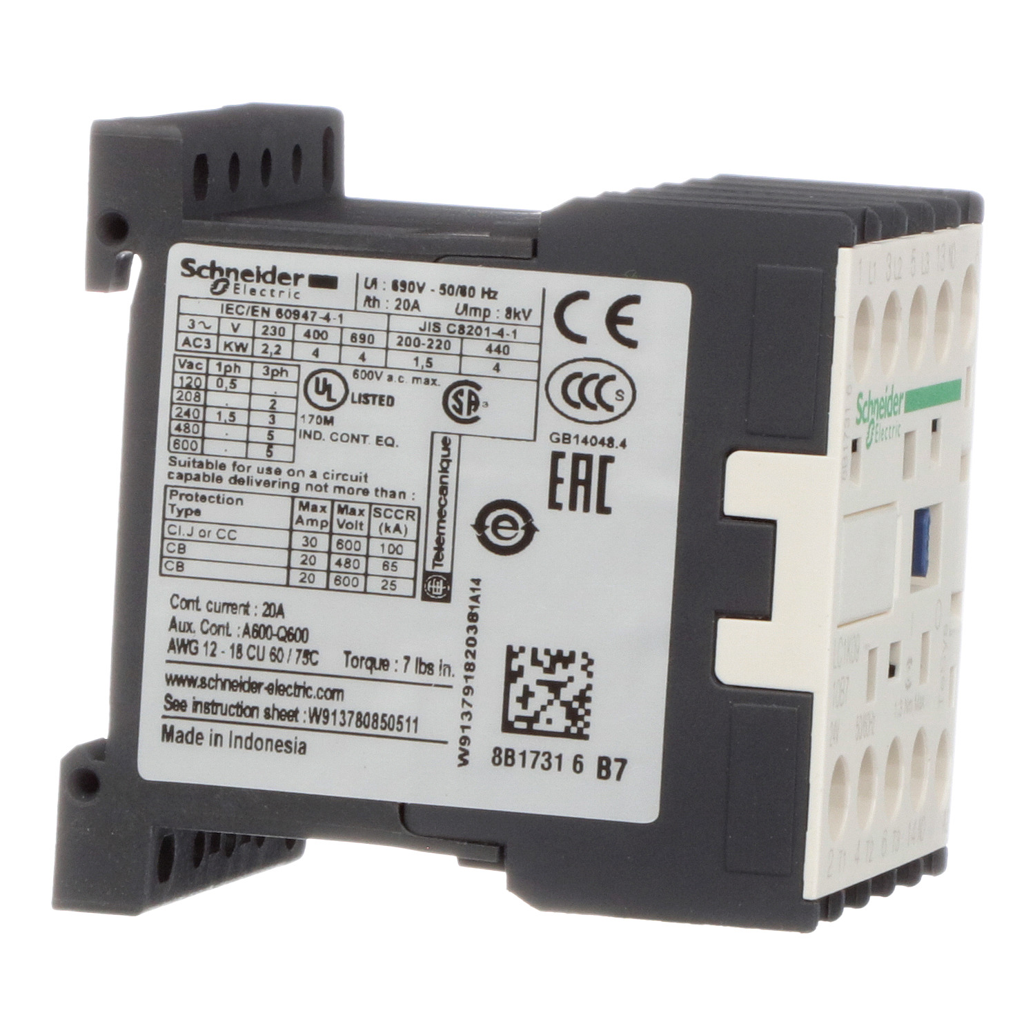 Leistungsschütz TeSys LC1K. 3 polig, 3 Schließer. Zusätzliche Hilfskontakte- 1 Schließer, Bemessungsbetriebsleistung bei AC-3, 400 V 4 kW, Bemessungsbetriebsstrom Ie bei AC-3, 400 V 9 A, Spule 24 V AC. Kategorie AC-3, AC-1, AC-4. Einfache Maschinensteuerung in Industrie, Infrastruktur und Gebäudeanwendungen. Einfach zu bedienende Schnittstelle für elektronische Geräte (SPS). Zertifizierungen nach CSA, UL. Produktstandards gem.