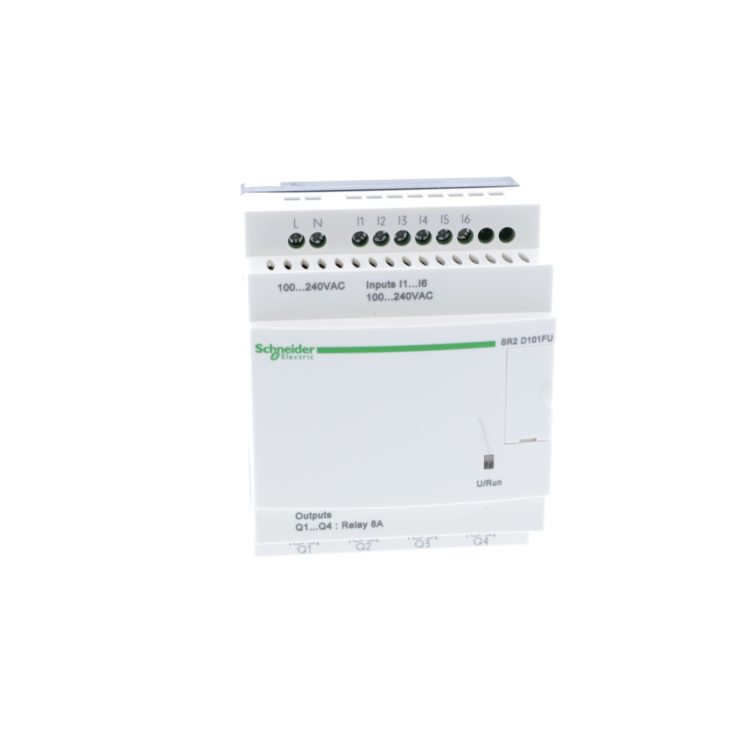 SPS-Steuerrelais Zelio Logic in kompakter Ausführung. Die Kleinsteuerung (Logikmodul) ist für einfache Automatisierungsaufgaben ausgelegt und bietet eine Alternative zu klassischen Schützsteuerungen oder kundenspezifischen Platinenlösungen. Insgesamt 10 integrierte E/A, davon 6 digitale Eingänge, 4 digitale Ausgänge. Die Spannungsversorgung erfolgt über 100 VAC bis 240 VAC. Die digitalen Ausgänge sind als Relais ausgeführt. Schutzart Klemmleiste IP20, Schutzart Frontplatte IP54. Montage auf 35mm Hutschiene. Programmierung mittels kostenfreier Software Zelio Soft in Kontaktplan (KOP), Funktionsbausteinsprache oder GRAFCET Ablaufsprache. Download unter www.se.com. Zertifiziert nach CE, cULus Listed, CSA, GL, GOST, C-Tick.