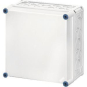 Schutzart IP 54 mit Einsteckstutzen, IP65 mit Anbaustutzen, zur Aufnahme von Geräten über Gerätetragschienen oder Montageplatten, aus Thermoplast, grau nach RAL 7032, Deckel mit Verschlüssen für Werkzeugbetätigung.