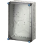 Schutzart IP 54 mit Einsteckstutzen, IP65 mit Anbaustutzen, zur Aufnahme von Geräten über Gerätetragschienen oder Montageplatten, aus Thermoplast, grau nach RAL 7032, Deckel mit Verschlüssen für Werkzeugbetätigung.