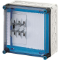 Schutzart IP65, aus Thermoplast, grau nach RAL 7032, transparente Deckel mit Verschlüssen für Werkzeugbetätigung, Sammelschienensystem 250 A, mit Berührungsschutz, Sicherungsunterteile. Größe NH 00, 690 V AC, Nennstrom 125 A.