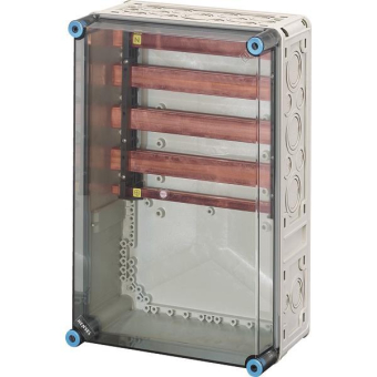 Gehäuse für den Bau von Energie-Schaltgerätekombinationen bis 630 A oder als Einzelgehäuse. Aus hochwertigem Polycarbonat schutzisoliert. Wanddurchführungen mit großen Öffnungen für die elektrische Verbindung der Gehäuse untereinander. Kabeleinführung an allen Gehäusewänden über metrische Vorprägungen oder Anbauflansche. Gehäuse zur Wandbefestigung auch über Außenlaschen oder mit Montageschienen. Gehäuse mit Sammelschienen, ohne Gerät, ohne Klemmen. Deckelverschlüsse für Werkzeugbetätigung.