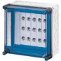 Gehäuse für den Bau von Energie-Schaltgerätekombinationen bis 630 A oder als Einzelgehäuse. Aus hochwertigem Polycarbonat schutzisoliert. Wanddurchführungen mit großen Öffnungen für die elektrische Verbindung der Gehäuse untereinander. Kabeleinführung an allen Gehäusewänden über metrische Vorprägungen oder Anbauflansche. Gehäuse zur Wandbefestigung auch über Außenlaschen oder mit Montageschienen. Gehäuse mit Sicherungselementen für D02-Sicherungseinsätze, E 18, auf Sammelschienen. Mit Zuleitungsklemmen, PE- und N-Klemmen und Berührungsschutz. Deckelverschlüsse für Handbetätigung.