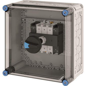 Gehäuse für den Bau von Energie-Schaltgerätekombinationen bis 630 A oder als Einzelgehäuse. Aus hochwertigem Polycarbonat schutzisoliert. Wanddurchführungen mit großen Öffnungen für die elektrische Verbindung der Gehäuse untereinander. Kabeleinführung an allen Gehäusewänden über metrische Vorprägungen oder Anbauflansche. Gehäuse zur Wandbefestigung auch über Außenlaschen oder mit Montageschienen. Gehäuse mit Lasttrennschalter 125 A, 4-polig, nach IEC 60947-3. Mit PE-Klemme für Kupferleiter. Griff des Lasttrennschalters abschließbar. Deckelverschlüsse für Werkzeugbetätigung.