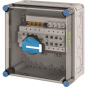 Gehäuse für den Bau von Energie-Schaltgerätekombinationen bis 630 A oder als Einzelgehäuse. Aus hochwertigem Polycarbonat schutzisoliert. Wanddurchführungen mit großen Öffnungen für die elektrische Verbindung der Gehäuse untereinander. Kabeleinführung an allen Gehäusewänden über metrische Vorprägungen oder Anbauflansche. Gehäuse zur Wandbefestigung auch über Außenlaschen oder mit Montageschienen. Gehäuse mit Lastumschalter (I-0-II), 4-polig, nach IEC 60947-3. Mit PE-Klemmen für Kupferleiter. Anschlussrichtung veränderbar. Griff des Lastumschalters abschließbar. Deckelverschlüsse für Werkzeugbetätigung.
