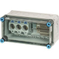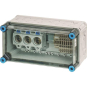 Gehäuse für den Bau von Energie-Schaltgerätekombinationen bis 630 A oder als Einzelgehäuse. Aus hochwertigem Polycarbonat schutzisoliert. Wanddurchführungen mit großen Öffnungen für die elektrische Verbindung der Gehäuse untereinander. Kabeleinführung an allen Gehäusewänden über metrische Vorprägungen oder Anbauflansche. Gehäuse zur Wandbefestigung auch über Außenlaschen oder mit Montageschienen. Gehäuse mit Messtrennklemmen und Spannungspfadsicherung montiert auf Tragschiene. Deckelverschlüsse für Werkzeugbetätigung.