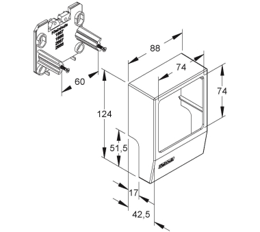 Gerätetank, mit Auschnitt 74 x 74 mm, für Installationsgeräte mit Kombinationsrahmen. für Sockelleistenkanalsystem : SDK50 T/SDK50 Abmessungen (ca. Maße) H x B x T : 124 x 88 x 42,5 mm Werkstoff : ASA (Acrylsäureester-Styrol-Acrylnitril-Pfropfcopolymer) Farbton : reinweiß RAL : 9010 (ähnlich)