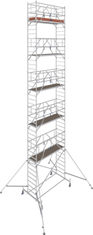 Das professionelle Alu-Fahrgerüst für schnelle und sichere Montage. + TÜV-geprüft, Belastbarkeit 200 kg/m² (Gerüstgruppe 3) nach DIN EN 1004-1 + Arbeitshöhe bis zu 14,40 m + Durch die Befestigung des Geländerrahmens GuardMatic-System vor dem Einhängen der nächsthöheren Belagbühne ist der sichere Aufbau gewährleistet. Beim Durchsteigen der Belagbühne ist ein komplettes Geländer und damit eine Absturzsicherung vorhanden + Die Integration der Diagonalen in das GuardMatic-System gewährleistet eine einfache und sichere Montage. Für Transport oder Lagerung kann der Geländerrahmen platzsparend zusammengefaltet werden + Die 6-Punkt-Fixierung des GuardMatic-Systems sorgt für maximale Stabilität in der Höhe. Das einzigartige selbstsichernde KRAUSE-Verriegelungssystem mit einer formschlüssigen Verbindung ermöglicht den einfachen, schnellen und sicheren Auf- und Abbau + Die innovative Form der Diagonalen bietet eine maximale Nutzfläche auf der Belagbühne und stört in keiner Weise + Maximaler Belagbühnenabstand von 2 m für komfortablen und sicheren Aufbau ohne Hilfsmittel + Stabile Stahlfahrtraversen sorgen für sicheren Stand (ab Arbeitshöhe 4,40 m) + Höhenverstellbare Fahrrollen (Ø 150 mm) gewährleisten durch das integrierte Spindelgewinde auch den Einsatz auf unebenem Gelände (stufenloser Verstellbereich: 220 - 335 mm) + Leicht zu montierende Ausleger mit stufenlos teleskopierbarem Schwenkfuß (Verstellbereich bis zu 230 mm) sorgen ab einer Arbeitshöhe von 7,40 m auf jedem Untergrund für eine sichere Abstützung und Stabilität für große Höhen + Feldlängen: 2,00 m und 2,50 m + Gerüstfeldbreite: 0,75 m