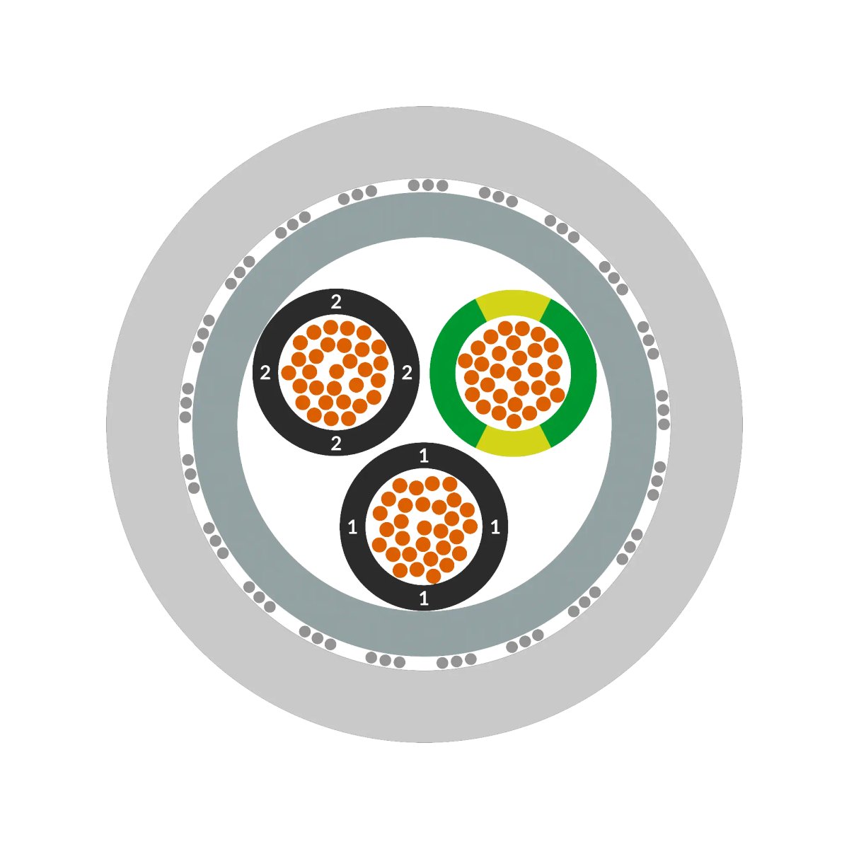 · Das Kupfergeflecht dient der elektromagnetischen Abschirmung zwischen den innengeführten Stromkreisen und der Umgebung