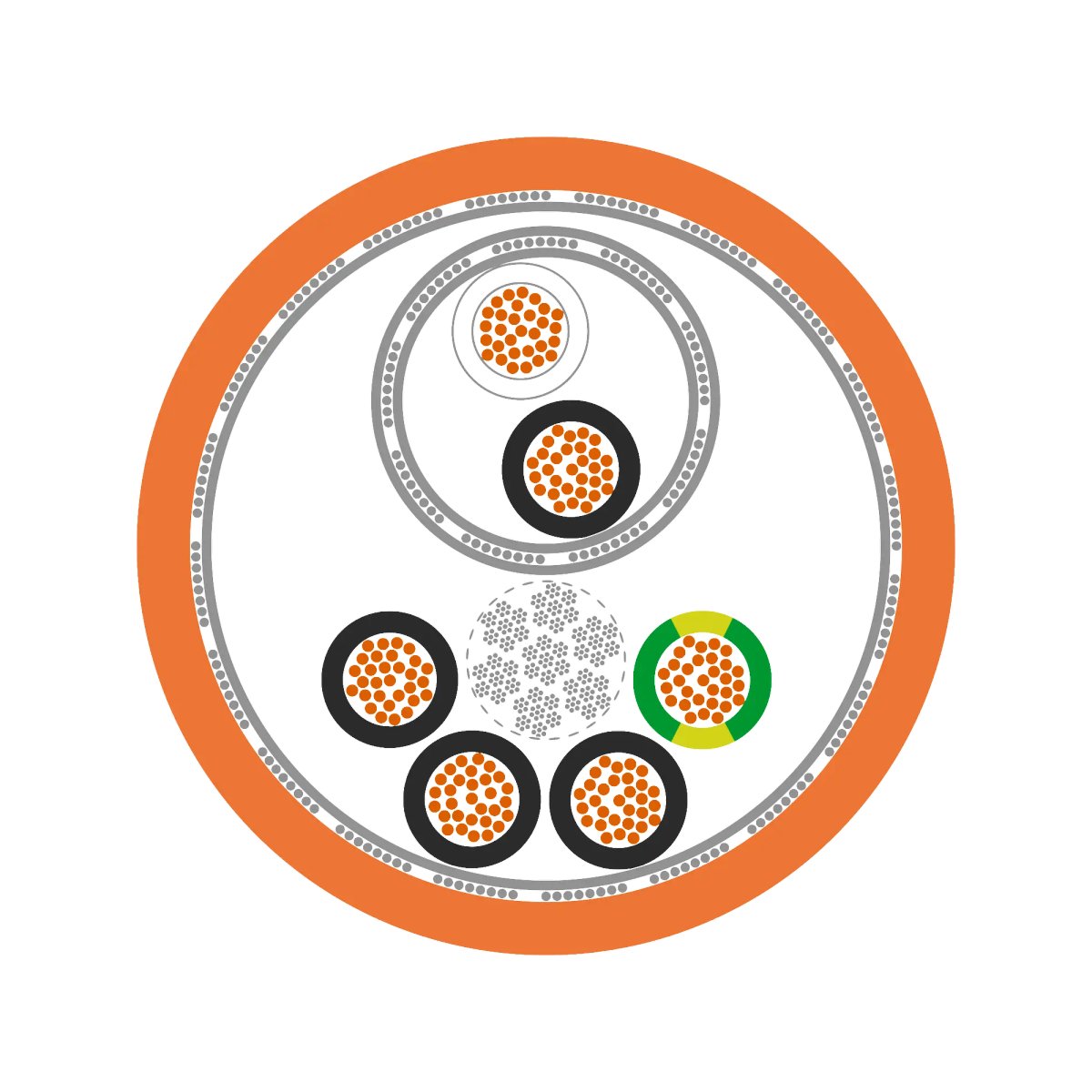 · Artikelindividuelle Ausführung: Leistungsadern ohne bzw. mit einem oder zwei separat geschirmten Steueraderpaaren gemeinsam in kurzen Schlaglängen verseilt