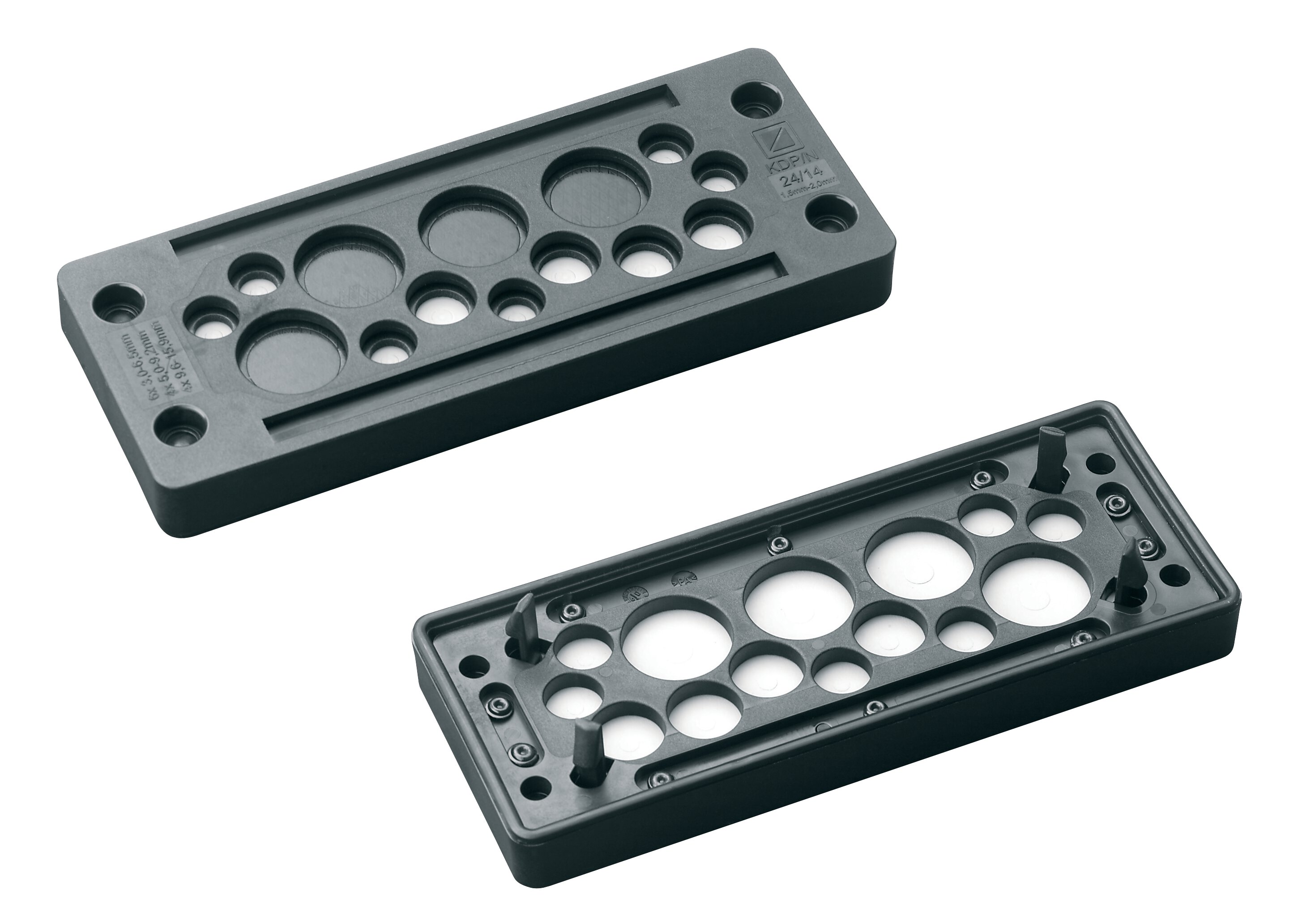 Kabeldurchführungsplatte Kunststoff Typ KDP/N 24 // KDP/N 24/14: Schwarz // Rastbare Kabeldurchführungsplatte aus Kunststoff mit zwei Elastomerplatten Werkzeugfreie, rationelle Anschlusstechnik für die Verdrahtung von Maschinen und AnlagenDie Alternative zur KabelverschraubungSehr gute ZugentlastungSchutzklasse: IP 65Temperaturbeständigkeit: -30 °C bis +70 °CMaterial: Rahmen: Polyamid 6.6 / Dichtung: TPU/NBR/EPDMRoHS-konformUV-BeständigMade in GermanyPassend auf Standardausschnitte für 24-polige IndustriesteckverbinderMontage durch Rasthaken (Blechstärke 1,5 mm 2,0 mm) oder mit M5-Schrauben möglich