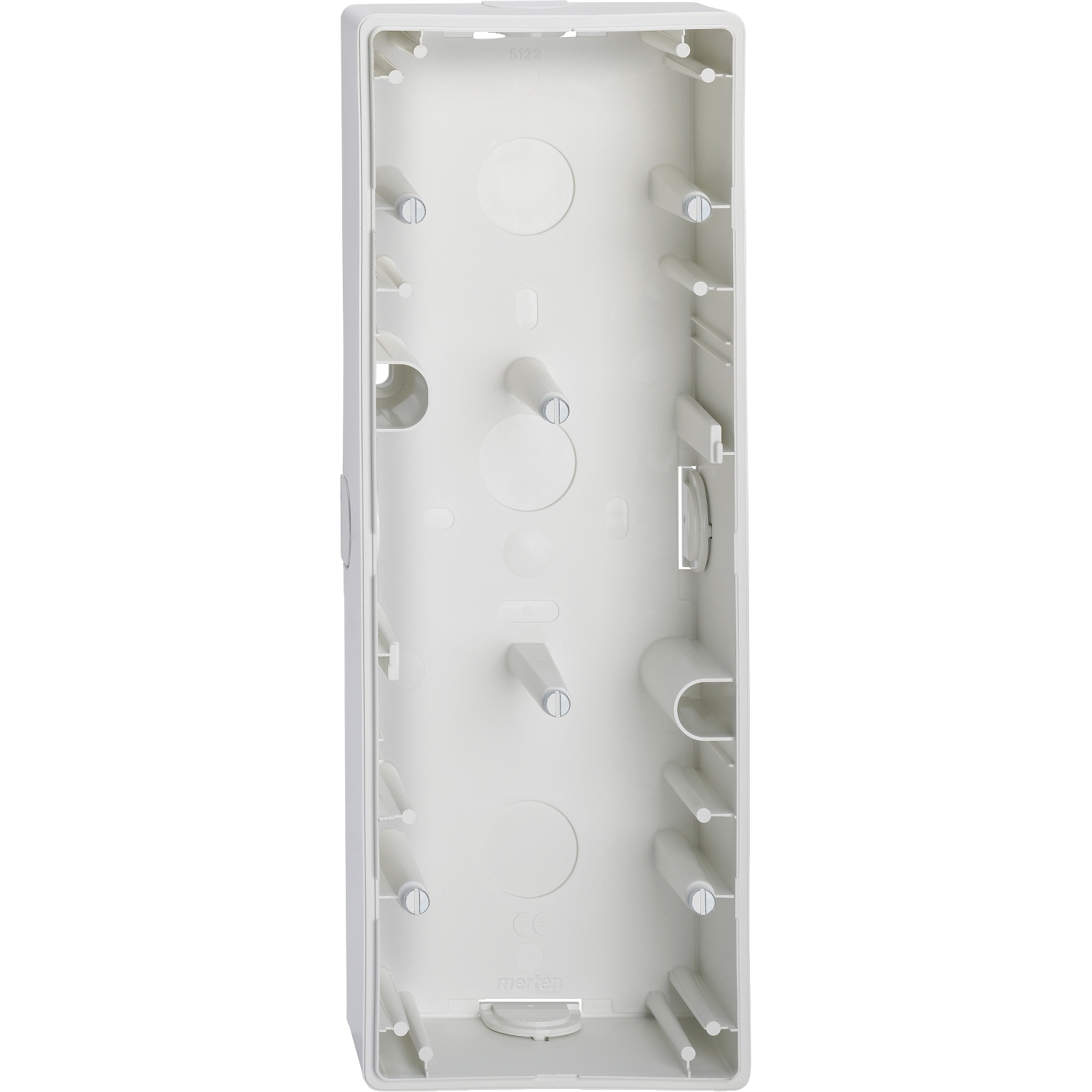 Mit geschlossenem Boden und Führungsnuten für Trennwände. 4 vorgeformte Leitungseingänge, verschlossen mit Blindschiebern. Auf jeden Baustoff montierbar. Führung für Trennwand.