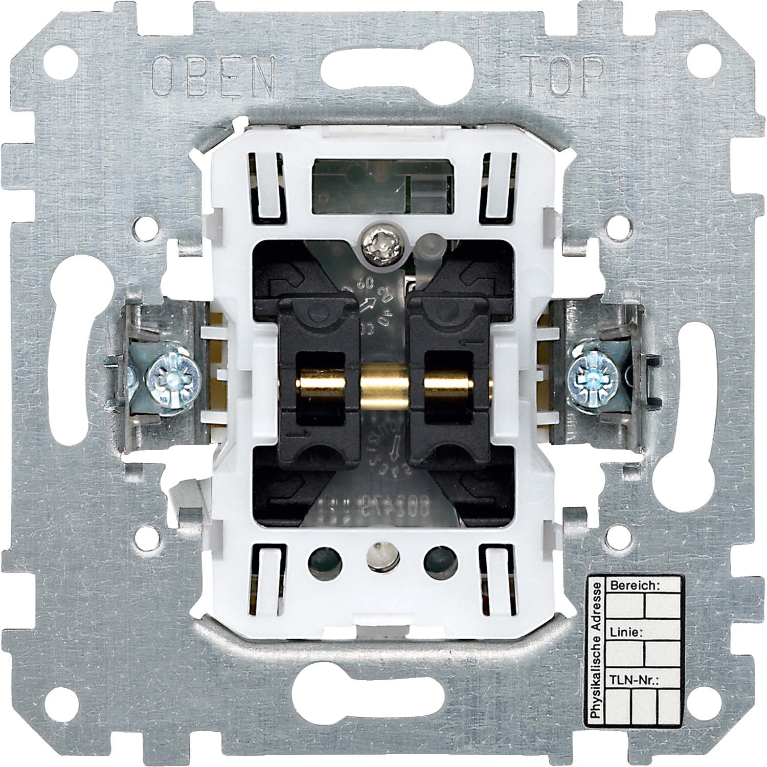 Die Wippe für Serienschalter. Wippe für Rollladenschalter und -taster aus Systemm, System Design und System Fläche können auf den Busankoppler-Einsatz 2fach aufgesteckt werden. Als Sonderanfertigung können auch die Schalterprogramme AQUADESIGN und AQUACLASSIC für den Busankoppler-Einsatz 2fach angepasst werden. Mit integriertem Busankoppler. Bei der Ausführung mit Mittelstellung können die Wippen nach oben und nach unten betätigt werden (Dreistellungswippe). Bei der Ausführung ohne Mittelstellung werden nur bei Betätigungen der unteren Wippenhälfte Telegramme erzeugt (Zweistellungswippe). Für die Montage in eine 60er-Installationsdose. Mit Taster und LED für den Programmiervorgang. Softwarefunktionen KNX: Für Artikelnummer 671298: Schalten. Umschalten. Dimmen. 1 Jalousiegruppe. Für Artikelnummer 671299: Schalten. Umschalten. Dimmen. 2 Jalousiegruppen. Ausführung: mit Mittelstellung.