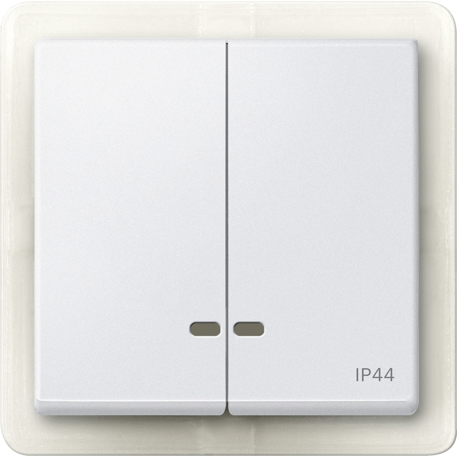 Für Serien- und Doppeltaster-Einsatz. Schutzart IP 44 Spritzwassergeschützt. Zu komplettieren mit Schalter und Taster, 2-fach. Material Thermoplast edelmatt. Farbe polarweiß.