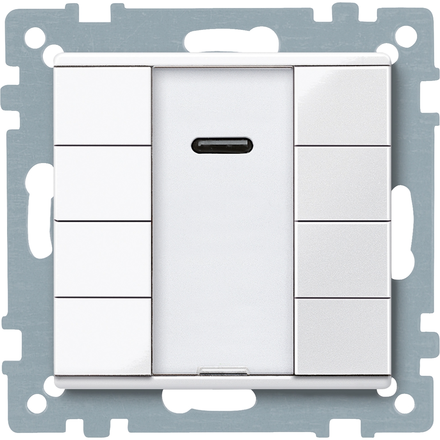 Mit integriertem Busankoppler. Taster mit 8 Bedientasten, Betriebs-, Statusanzeige und Schriftfeld. Die Betriebsanzeige kann auch als Orientierungslicht verwendet werden. Die jeweiligen Funktionen der Tasten können mit einer IR-Fernbedienung angesteuert werden.