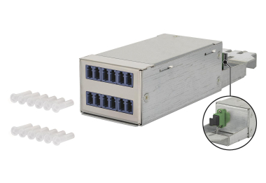 DCCS-Gehäuse mit 6 Duplex-Kupplungen frontseitig und einer MTP-Kupplung rückseitig montiert. Ader-Fanout mit 12 Adern innen eingebaut.Einfache Montage/Demontage in DCCS-Baugruppenträger (19 Zoll, 1 HE), Geeignet zur Aufteilung oder Kombination von Duplex- auf Mehrfaser-Kabel.Belegung/Polarität: Typ A (Duplex-Paarung: 1+2/3+4/...) oder Typ B (Duplex-Paarung: 1+12/2+11/...), Gehäuse: Stahlblech verzinkt, Front Edelstahl, Varianten: blau (SM), grün (SM APC), lindgrün (OM5), violett (OM4), aqua (OM3), alle verfügbaren Varianten können über den DCCS-LWL-Konfigurator erstellt werden