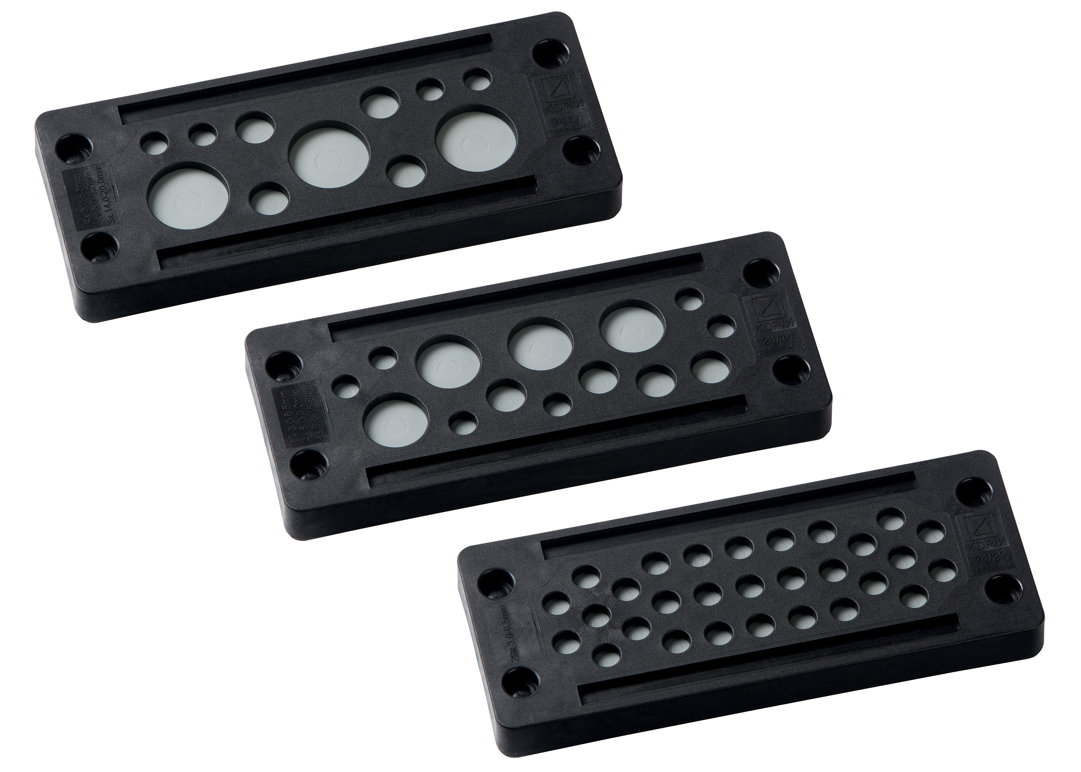 KDP/X 24/22: Schwarz // Kabeldurchführungsplatte aus Kunststoff mit Rastfunktion und einer, anstelle von zwei ElastomerplattenWerkzeugfreie, rationelle Anschlusstechnik für die Verdrahtung von Maschinen und AnlagenDie Alternative zur KabelverschraubungSehr gute ZugentlastungSchutzklasse: IP 65Temperaturbeständigkeit: -30 °C bis +70 °CMaterial: Gehäuse: Polyamid 6.6 / Dichtung: TPU/EPDMRoHS-konformUV-BeständigMade in GermanyPassend auf Standardausschnitte für 24-polige IndustriesteckverbinderMontage durch Rasthaken (Blechstärke 1,5 mm 2,0 mm) oder mit M5-Schrauben möglich