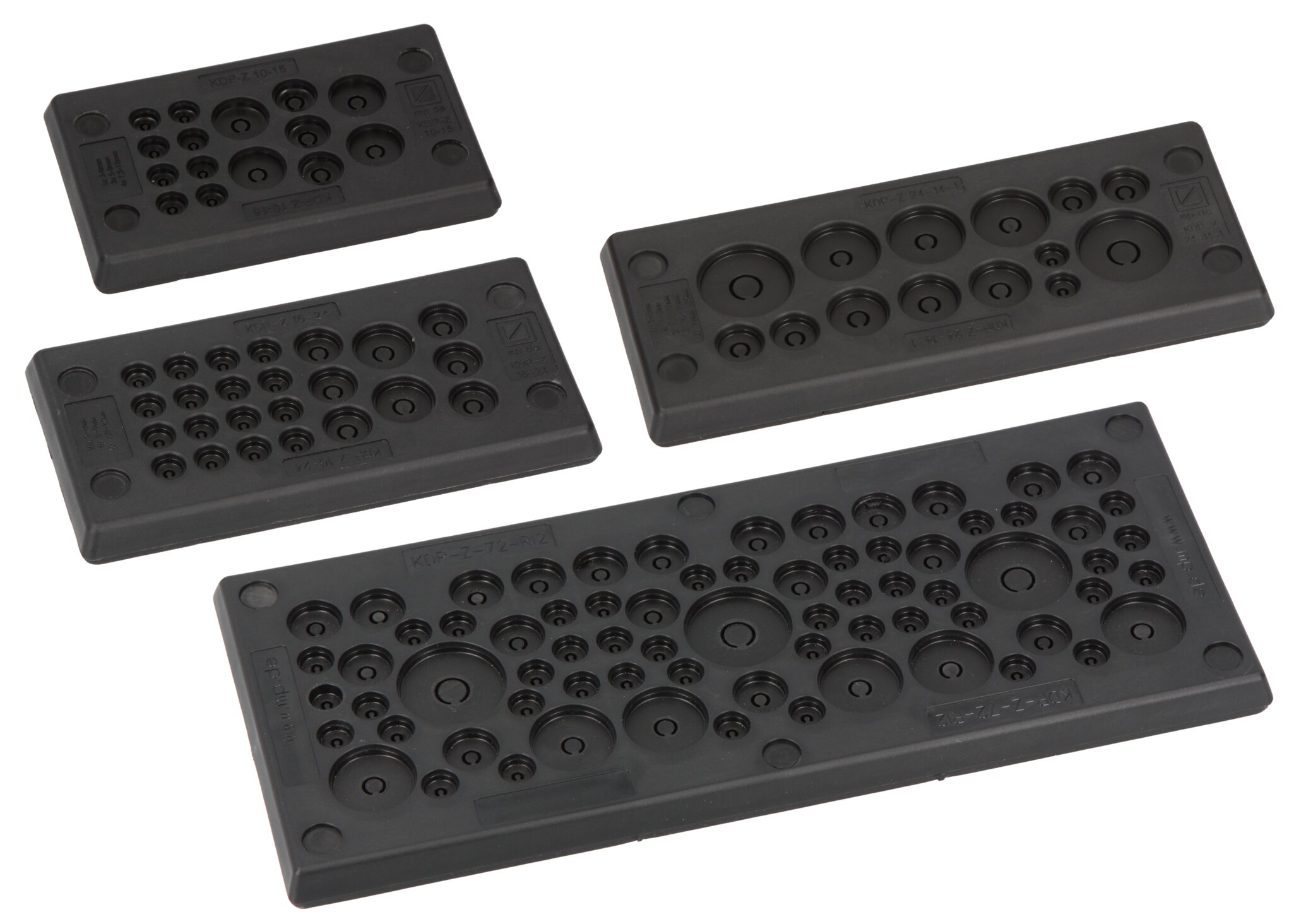 Kabeldurchführungsplatte Kunststoff Typ KDP/Z // KDP/Z 24/14-1, VE 5: Schwarz // Sehr flache Kabeldurchführungsplatte aus Kunststoff mit einer 2-Komponenten Bauart und besten EigenschaftenGroße Zeitersparnis bei der MontageHohe PackungsdichteGroßer LeitungsdurchmesserbereichGute ZugentlastungSchutzklasse: IP66/67, IP69K (mit passenden Leitungen und verschraubt) Brandklasse: HBTemperaturbeständigkeit: -30 °C bis +70 °CMaterial: Rahmen: Polypropylen (PP) / Dichtung: TPERoHS-konformUV-BeständigMade in GermanyPassend auf Standardausschnitte von IndustriesteckverbinderMontage durch Clips oder mit M5-Schrauben möglich