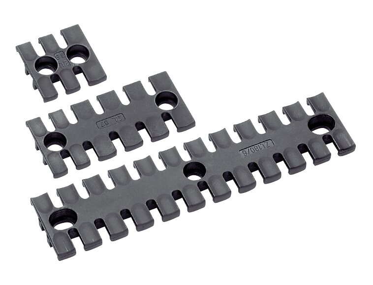 Zugentlastung Typ ZL // ZL 60: Schwarz // Die Zugentlastungsleiste ZL kann überall dort eingesetzt werden, wo Leitungen, Kabel, Einzeladern oder Schläuche sicher, einfach und kostengünstig zugentlastet oder geführt werden müssen. Die Einlegebuchse ELB verhindert Kaltfließeigenschaften an den Befestigungen der Zugentlastung. Zum doppelstöckigen Aufbau wird die Distanzhülse DH benötigt.
