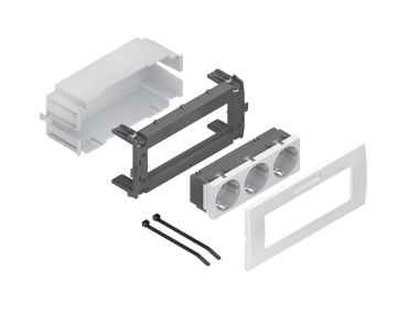 Vorkonfektioniert, einfach, waagerecht, anschlussfertig vorverdrahtet, komplett mit Adapter-/ und Abdeckrahmen. Mit Etikett und Sichtfenster für Beschriftungsfeld, mit erhöhtem Berührungsschutz, mit Steckklemmen für 1,5 - 2,5 mm2, 2 - polig, mit zwei Kabelbinder für die Zugentlastung. Verwendbar für: Gerätekanalunterteile GKU...