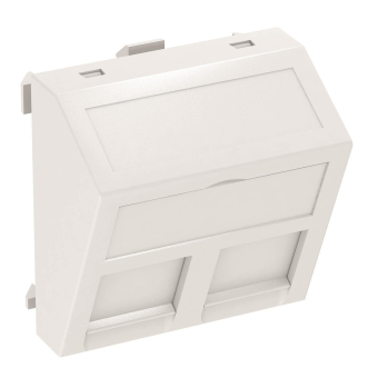 Datentechnikträger mit schrägem Auslass und Verschlussschieber zur Aufnahme von zwei Datentechnik-Anschlussmodulen mit RJ45-Buchse. Der Datentechnikträger ist für die Aufnahme der nachfolgenden Datenanschlussmodule geeignet: Typ ASM-C5, ASM-C5 G, ASM-C6 und ASM-C6 G.