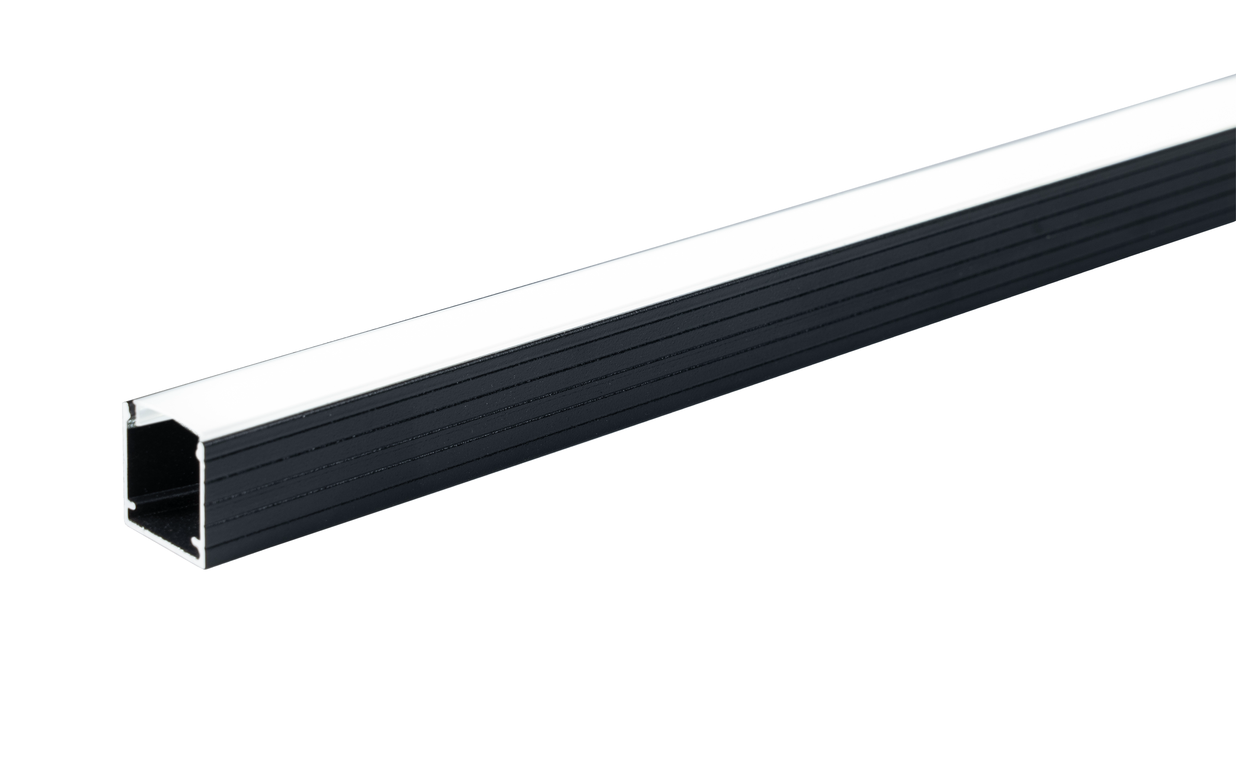 2m 15mm x 15mm schwarzes Aluminiumprofil, mit aufklickbarer Polycarbonatabdeckung, 2 Montageclips, Profilanschlussstück und Endkappe mit Verdrahtungsmöglichkeit