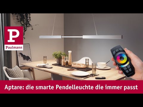 Die ausziehbare Hängelampe Aptare incl. der Fernbedienung Gent ist perfekt zur Beleuchtung ausziehbarer Tische. Sie lässt sich zwischen 90 cm bis 150 cm in der Höhe verstellen und von 132 cm auf 180 cm verlängern. Nach oben gibt sie 40% indirektes und nach unten 60% direktes Licht ab. Mit der enthaltenen Zigbee-Fernbedienung lässt sich sowohl schalten als auch dimmen.