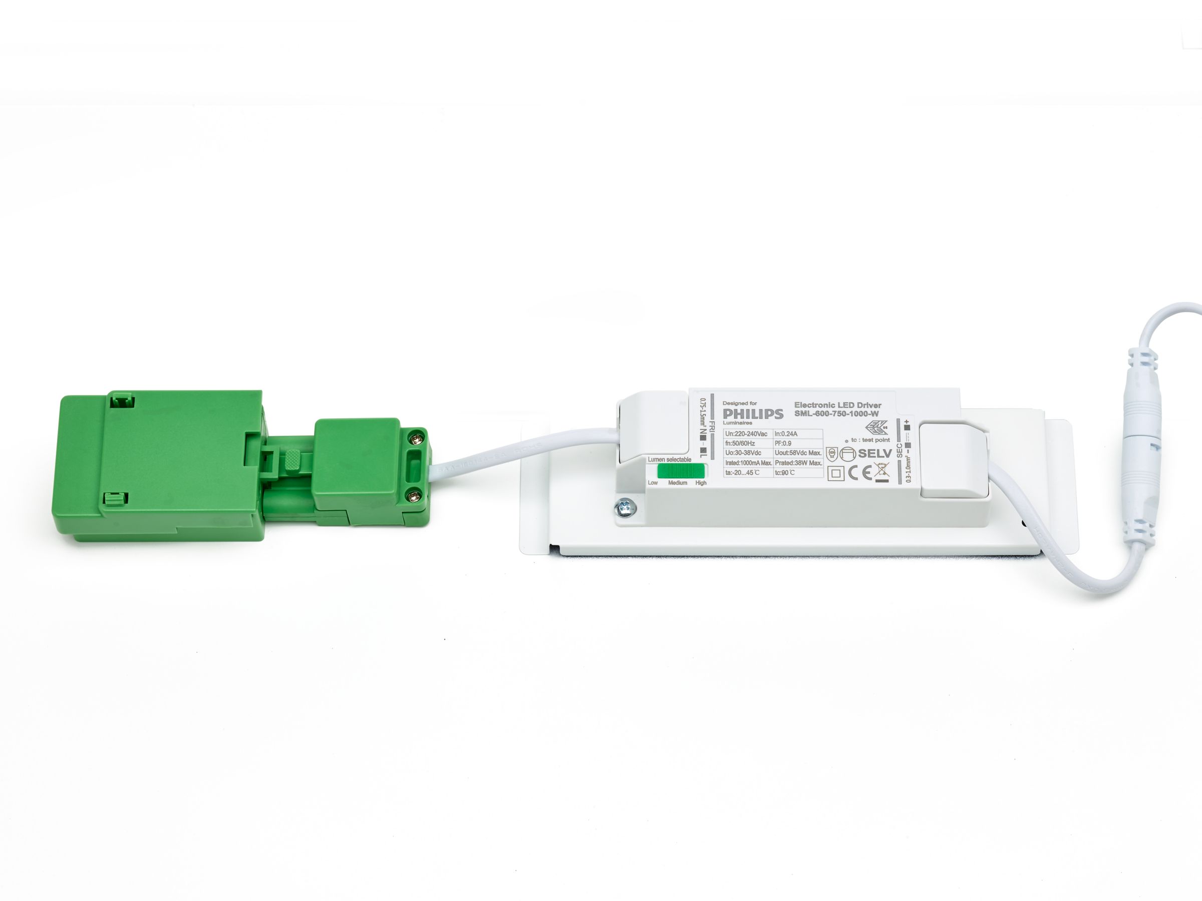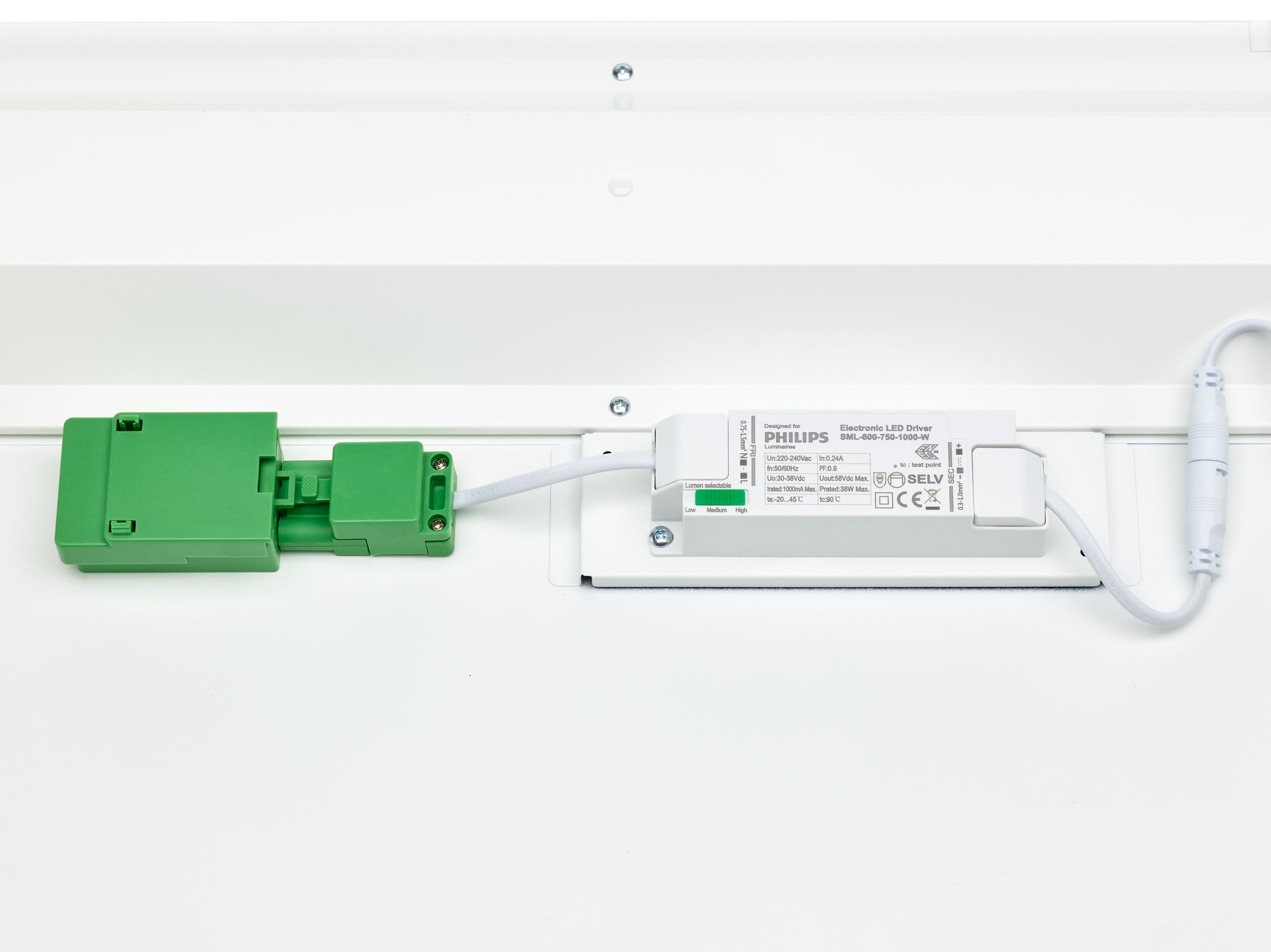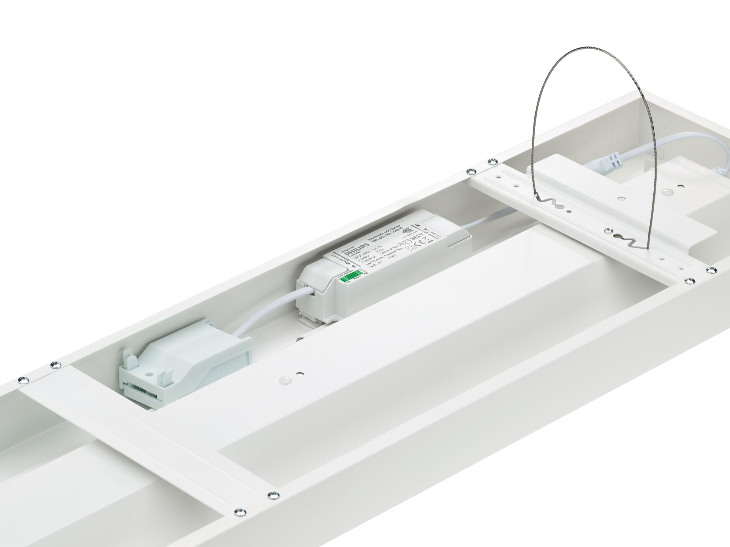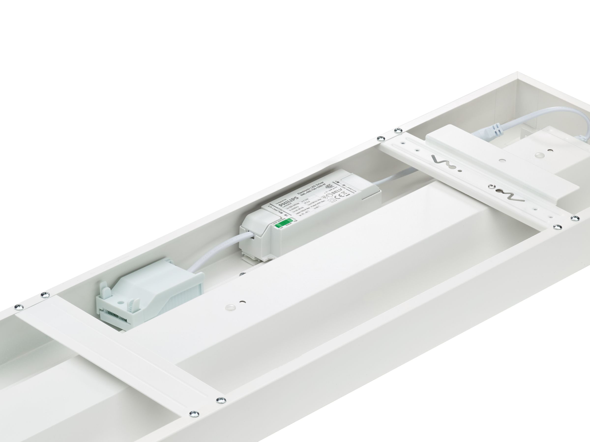 200x1570 mm, Stahl, Weiß, Signalweiß (RAL9003), Oberfläche, Netzteil (Ein/Aus), All-in, Multi Lumen, 3600 lm, 4500 lm, 6800 lm, 43.5 W, 22.5 W, 160 lm/W, 155 lm/W, 4000 K, (0.38.0.38)SDCM3, UGR19, Breitstrahlend, Office-kompatibel, Mikroprismatische Linse, Polykarbonat, IP20/44 | Fernhalten von Fingern; Drahtschutz, spritzwassergeschützt, IK03 | 0,35 J verstärkt, SchutzklasseII, Kabel mit Steckverbinder, 3-polig, Steckverbinder, 3-polig