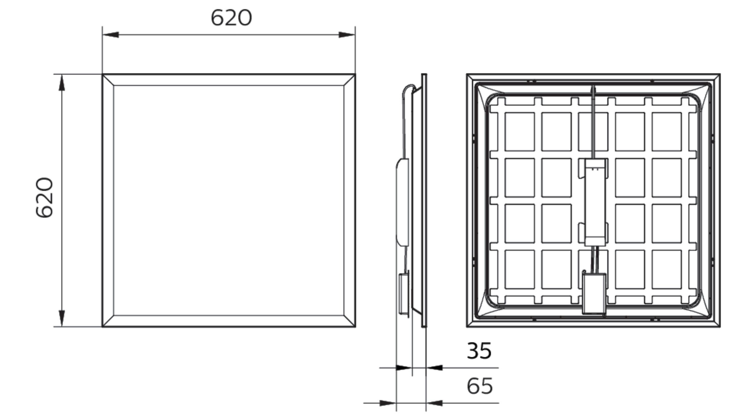625x625 mm, Stahl, Weiß, Signalweiß (RAL9003), Netzteil mit DALI-Schnittstelle, 3400 lm, 34 W, 100 lm/W, 4000 K, (0.38, 0.38) SDCM =5, UGR19, Abstrahlungswinkel (90°), Mikroprismatische Linse, Acrylat, Fernhalten von Fingern, 0,2 J Standard, SchutzklasseII, Schnellsteckverbinder, 5-polig