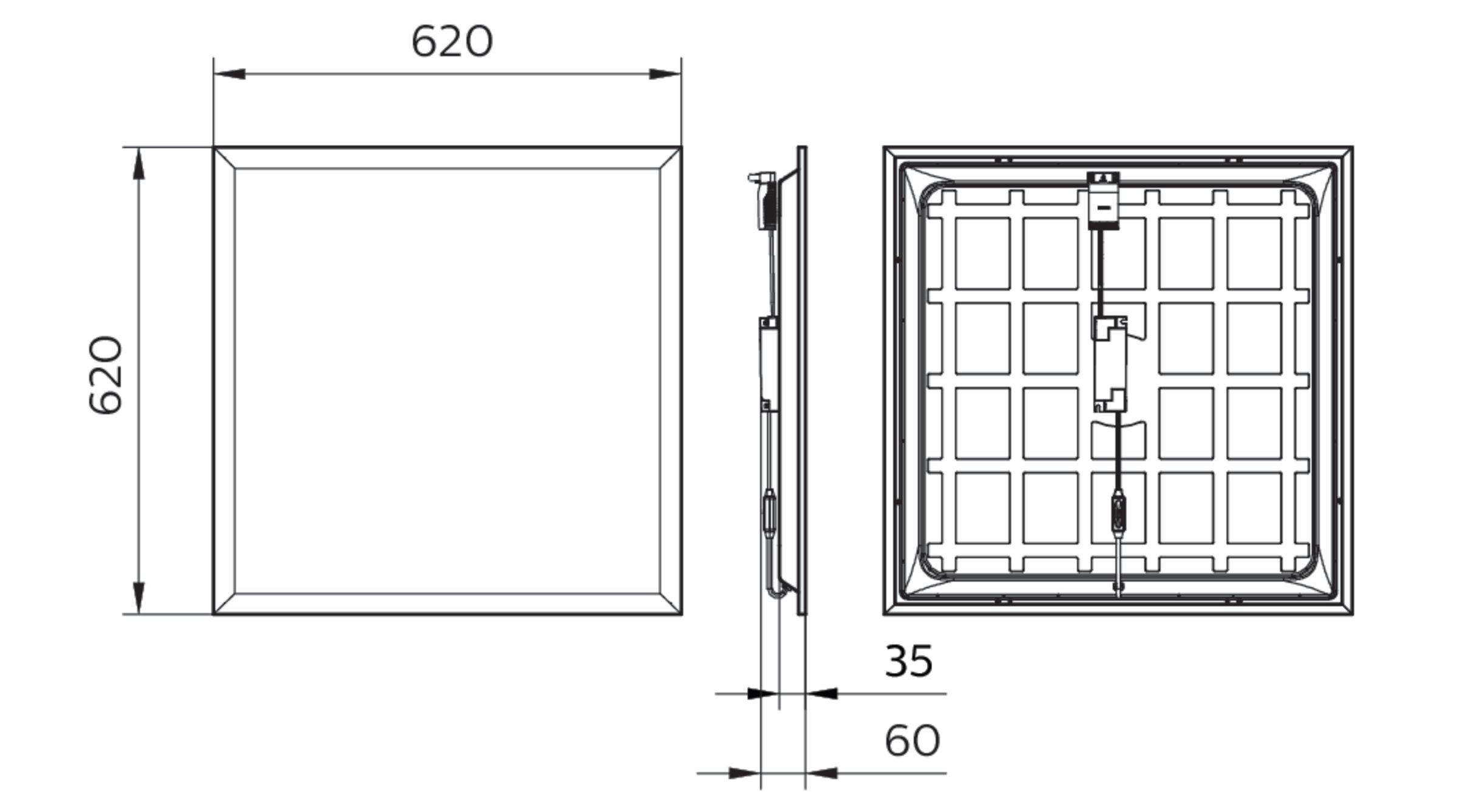 625x625 mm, Stahl, Weiß, Signalweiß (RAL9003), Netzteil (Ein/Aus), All-in, Multi Color Temperature, 3400 lm, 34 W, 100 lm/W, 3000 K, 3500 K, 4000 K, (0.38, 0.38) SDCM =5, UGR19, Abstrahlungswinkel (90°), Mikroprismatische Linse, Acrylat, Fernhalten von Fingern, 0,2 J Standard, SchutzklasseII, Schnellsteckverbinder, 3-polig