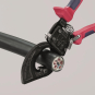 95 31 250 Kabelschneider geringer Kraftbedarf durch sehr hohe Übersetzung. einfache Handhabung durch geringes Gewicht und kompakte Bauweise Einsatz auch unter beengten Platzverhältnissen möglich. Zum Schneiden von Cu- und Al-Kabeln, ein- und mehrdrähtig, bis Ø 32 mm (240 mm²). Nicht für Stahldraht, Drahtseile und feinstdrähtige (hochflexible) Leiter geeignet. Gehärtete Schneiden mit Präzisionsschliff. Schneidet glatt und sauber, ohne zu quetschen. Einhandbedienung durch Ratschenprinzip. Zweigang-Zahnkranzantrieb für leichtes Schneiden. Klemmschutz verhindert Quetschverletzungen. Festschenkel-Hülle mit Standfläche zum Auflegen beim Schneiden. - Schneidwert Cu-Kabel, mehrdrähtig: 240mm² - Schneidwert Cu-Kabel, mehrdrähtig: Ø 32mm - MCM: 500.