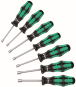 7-teiliger Steckschlüssel-Schraubendrehersatz von Wera. Hohlschaft zur Verschraubung bei Gewindestangen, denn nur dann kann die Gewindestange durch die Schraubenmutter in den hohlen Schaft des Schraubendrehers eindringen. Mehrkomponentiger Kraftform Griff für hohe Arbeitsgeschwindigkeiten und besonders ergonomisches Verschrauben. Mit Sechskantabrollschutz gegen Wegrollen. Mit Griffkennzeichnung zum leichteren Finden und Sortieren des Werkzeugs. Für Außensechskantschrauben.