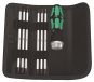 Falttasche mit 6 175 mm langen Wera Vario Doppelklingen, 6 mm Sechskant. 1 Handhalter Kraftform Kompakt Vario RA mit Ratschenfunktion, Feinverzahnung für geringen Rückholwinkel, Umschaltring (rechts, fest, links), maximales Drehmoment von bis zu 50 Newtonmetern, 6 mm Innensechskantaufnahme für Wera Vario Doppelklingen, 6 Vario Doppelklingen (= 12 verschiedene Abmessungen). Komfortable Bit-Aufnahme/-Entnahme.