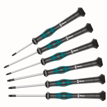 Hochwertiger Wera Micro Schraubendrehersatz für feinmechanische Verschraubungen. Für TORX® Sicherheitsverschraubungen: TORX® BO Schrauben besitzen in ihrem Antriebsprofil einen vorstehenden Zapfen. Damit wird unerlaubtes Lösen verhindert, denn mit "normalen" TORX® Werkzeugen können diese Schrauben nicht betätigt werden. Nur spezielle TORX® BO Werkzeuge weisen eine Bohrung auf, in die der Zapfen aufgenommen wird. Durch Abstützen der Hand auf der Drehkappe und durch die Schnelldrehzone unterhalb der Drehkappe ist blitzschnelles Zwirbeln möglich. Zeitintensives Umgreifen entfällt. Kraftzone mit integrierten Weichzonen sorgt für die Übertragung hoher Löse- und Anzugsmomente. Präzisionszone für den richtigen Drehwinkel bei Justierarbeiten. Die Wera Black Point-Spitze bietet Passgenauigkeit und optimierten Korrosionsschutz.