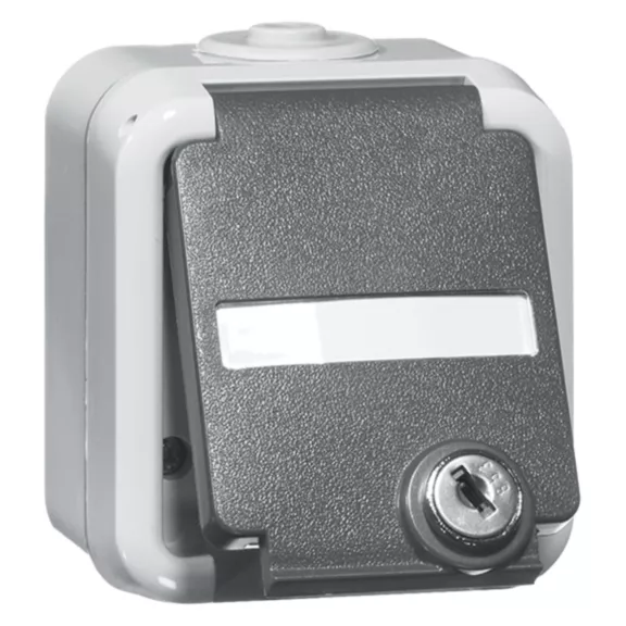 Aufputz-Steckdose mit Erdung, IP54, 1-polig, grau, abschließbarer Deckel, Textfeld