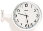 Innenuhr, rund, sehr stabiles, weiß lackiertes Metallgehäuse (RAL 9016) für hohe Beanspruchungen, mit stoßgeschützen Plexigläsern. Weiße Zifferblätter mit schwarzen arabischen Zahlen, Zifferblattdruck nach DIN 41091. Schwarze Balkenzeiger für Stunden- und Minutenanzeige. Betriebsspannung 230 V.