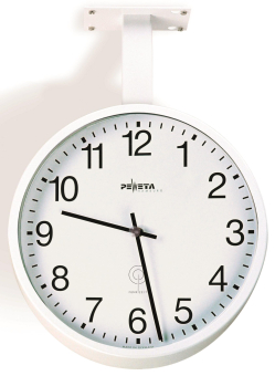 Innenuhr, rund, sehr stabiles, weiß lackiertes Metallgehäuse (RAL 9016) für hohe Beanspruchungen, mit stoßgeschützen Plexigläsern. Weiße Zifferblätter mit schwarzen arabischen Zahlen, Zifferblattdruck nach DIN 41091. Schwarze Balkenzeiger für Stunden- und Minutenanzeige. Betriebsspannung 230 V.
