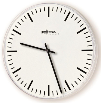 Innenuhr, rund, einseitig, schlagfestes Kunststoffgehäuse, mattierter Rand, flaches stoßgeschütztes Plexiglas. Weißes Metallzifferblatt mit schwarzen Feinstrichziffern, Zifferblattdruck nach DIN 41091. Schwarze Balkenzeiger für Stunden- und Minutenanzeige.