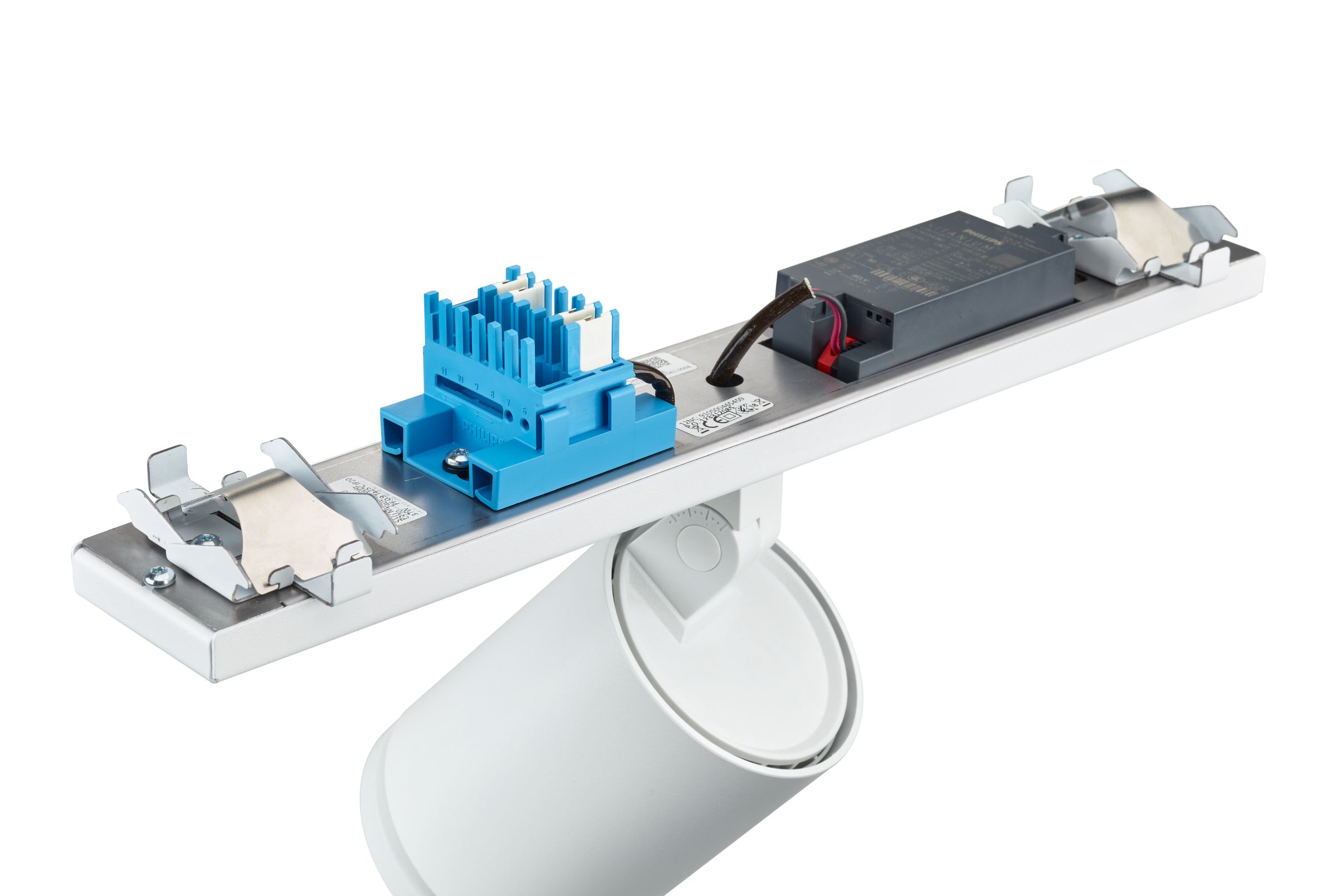 Compact, Maxos fusion variant, Aluminium, Weiß, Signalweiß (RAL9003), DALI-Dimmen Interact System Ready, 2700 lm, 35 W, 74 lm/W, 3000 K, (0.457,0.385)3, CRI90, Tiefbreitstrahlend (MB), Klar, Gehärtetes Glas, ?IP20 | Fernhalten von Fingern, IK02 | 0,2 J Standard, SchutzklasseI, 3-phasige Stromschiene