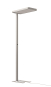 LED-Stehleuchte für Einzel- und Doppelarbeitsplatz mit intelligenter Anwesenheitssteuerung und Helligkeitssensorik. Betriebsgerät im Standrohr integriert. Abstrahlcharakteristik direkt/indirekt im Verhältnis 20:80. Lichtlenkung direkt über Diffusor Kunststoff mikroprismatisch (bildschirmgerecht gemäß DIN EN-12464-1). Lichtlenkung indirekt über Diffusor Kunststoff klar. Diffusoren aus vergilbungsfreiem Kunststoff (PMMA). Flache Fußplatte aus Stahl für hohe Standsicherheit und platzsparende Positionierung an Büromöbeln. Kopf und Säule aus Aluminium. Leuchte pulverbeschichtet. Wipptaster zum Schalten, Dimmen und Speichern von Helligkeitswerten. Mit Anschlussleitung 2 m inklusive Schutzkontaktstecker (Schuko). Dimmbereich 1 % bis 100 %. Leuchte geht nach Netzwiederkehr in Stand-by.