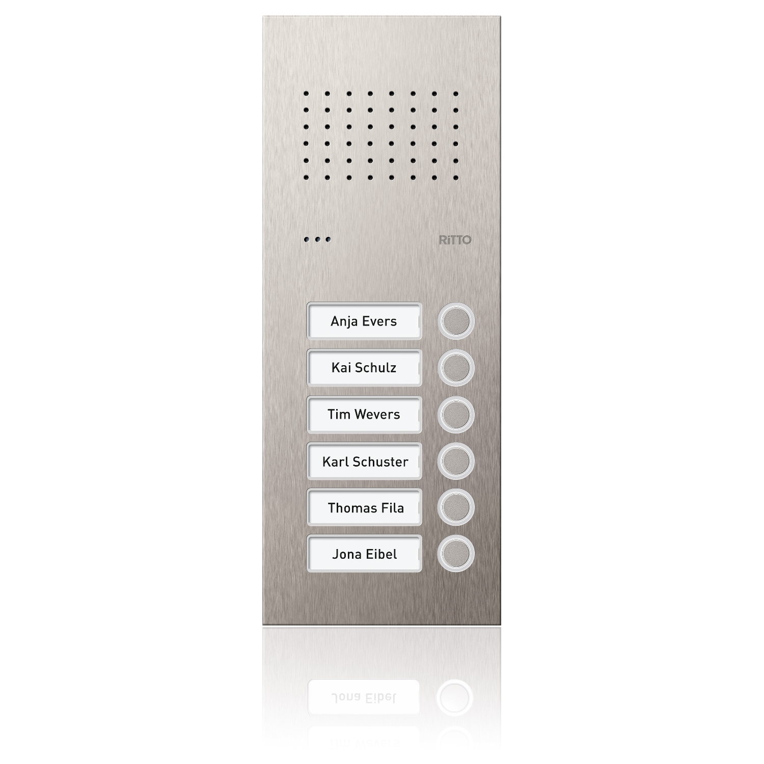 Edelstahl-Türstation mit vorinstalliertem Einbaulautsprecher. Frontplatte 2,5 mm Edelstahl. Beleuchtete Namensschilder. Klingeltasten mit weißen LEDs. Vandalismusgeschützt und gravierfähig. UP-Kasten nur 52 mm tief. Verdeckte Montageelemente bis zu einer Größe von 6 Klingeltasten.