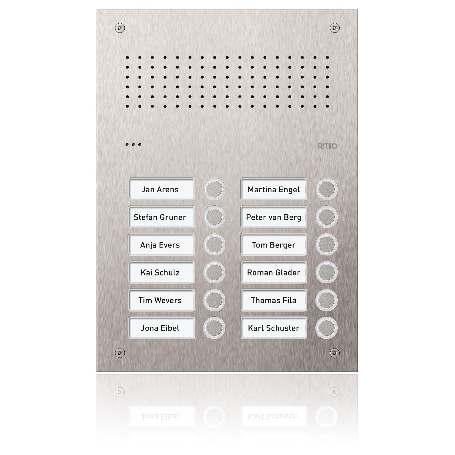 Edelstahl-Türstation mit vorinstalliertem Einbaulautsprecher. Frontplatte 2,5 mm Edelstahl. Beleuchtete Namensschilder. Klingeltasten mit weißen LEDs. Vandalismusgeschützt und gravierfähig. UP-Kasten nur 52 mm tief. Verdeckte Montageelemente bis zu einer Größe von 6 Klingeltasten.