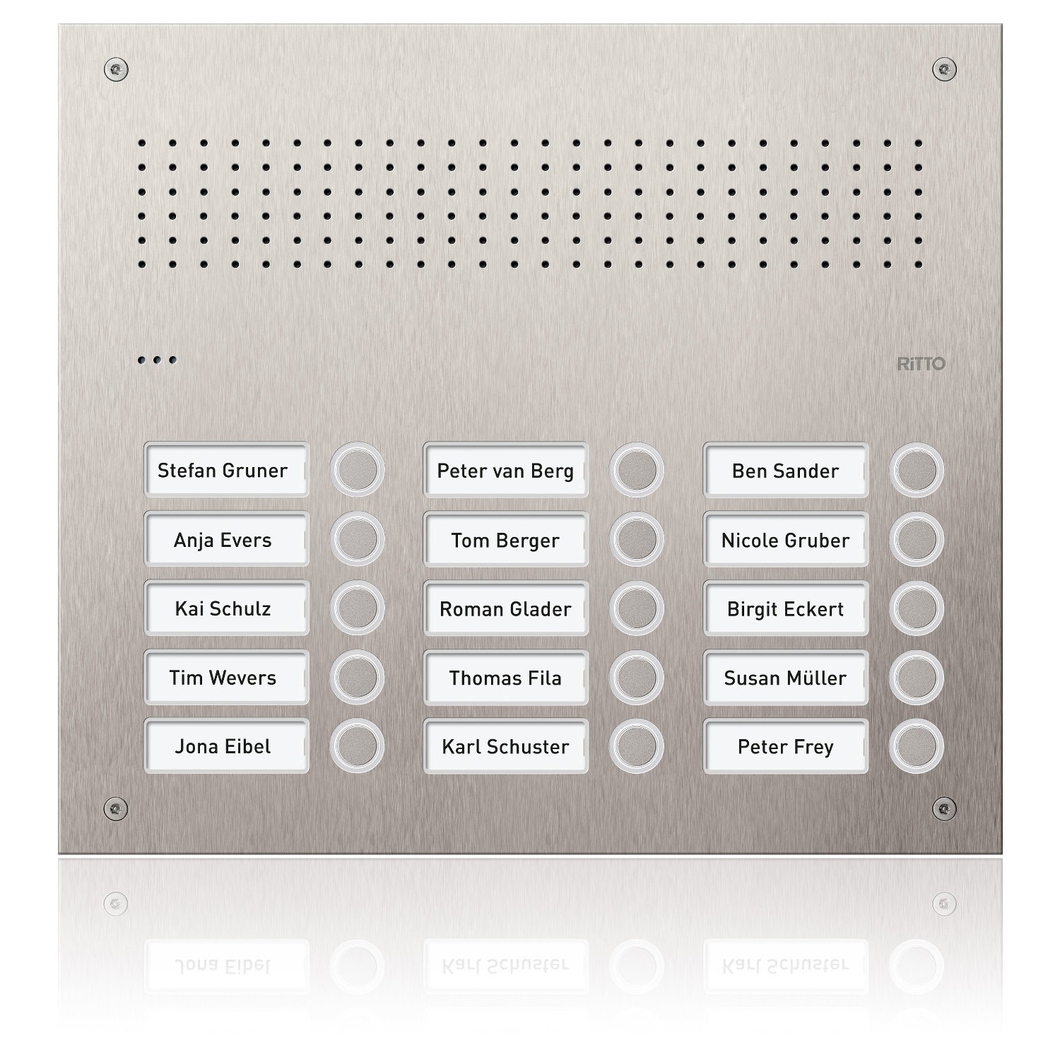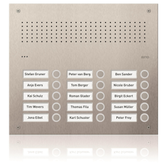 Edelstahl-Türstation mit vorinstalliertem Einbaulautsprecher. Frontplatte 2,5 mm Edelstahl. Beleuchtete Namensschilder. Klingeltasten mit weißen LEDs. Vandalismusgeschützt und gravierfähig. UP-Kasten nur 52 mm tief. Verdeckte Montageelemente bis zu einer Größe von 6 Klingeltasten.
