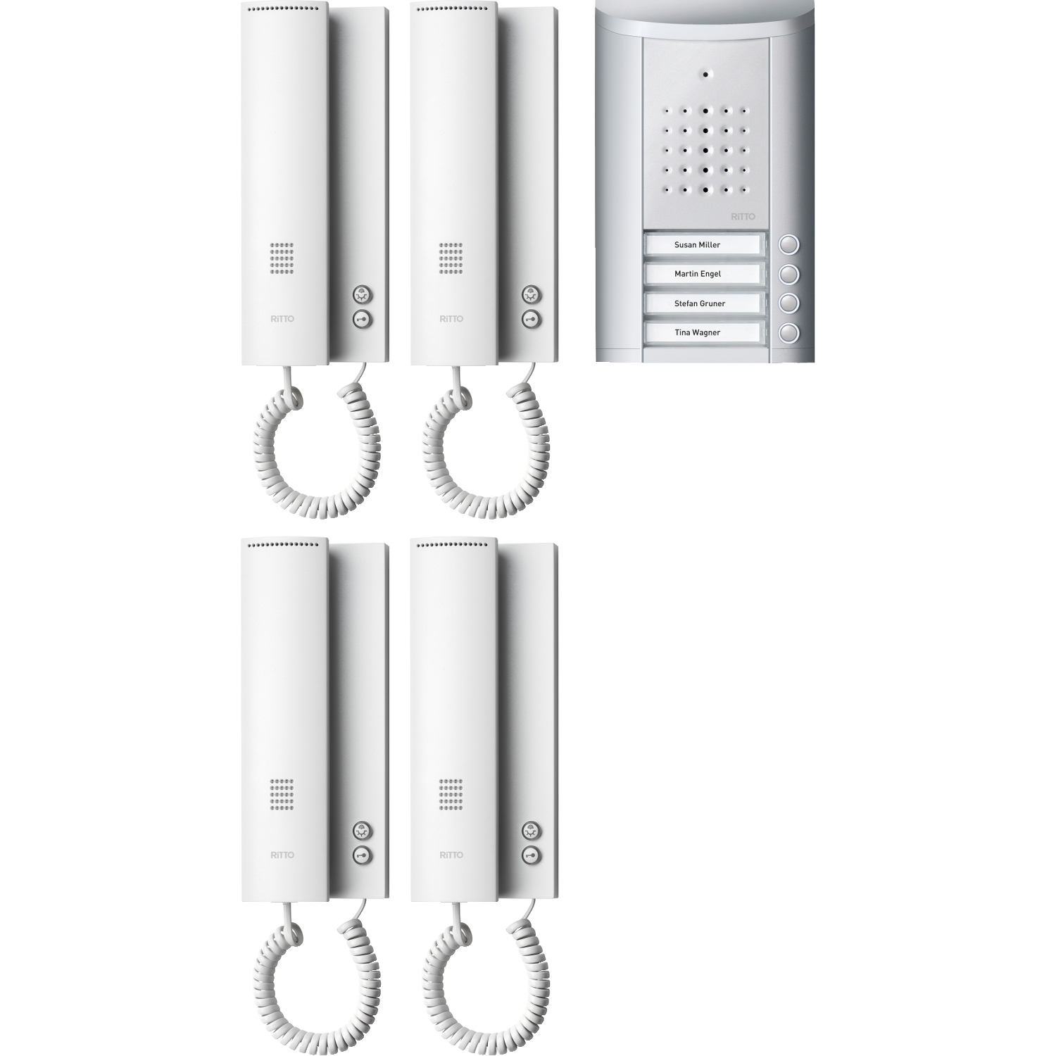 Komplette TwinBus Türsprechanlage, kompakte Entravox Türstation, 1-4 beleuchtete Klingeltasten und Namensschilder, weiß lackiert oder silber eloxiert. Entravox Netzgerät, 1-4 TwinBus Wohntelefone 17630, weiß.