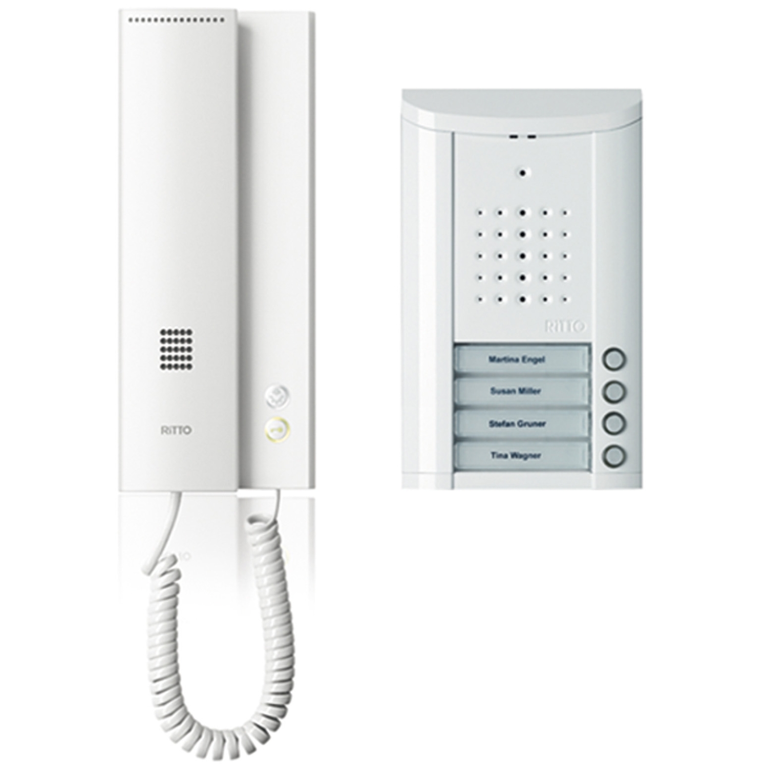 Komplette TwinBus Türsprechanlage, kompakte Entravox Türstation, 1-4 beleuchtete Klingeltasten und Namensschilder, weiß lackiert oder silber eloxiert. Entravox Netzgerät, 1-4 TwinBus Wohntelefone 17630, weiß.