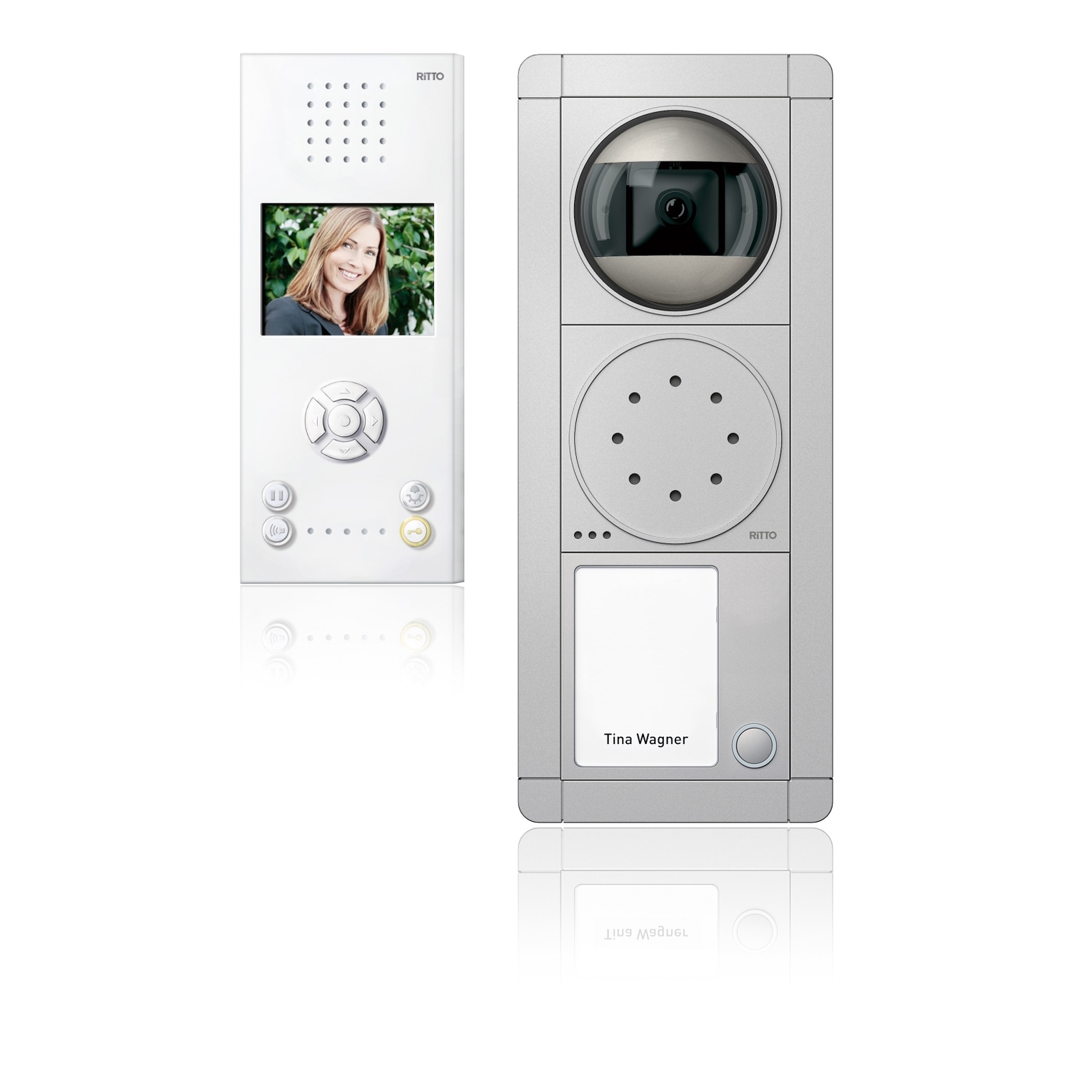 Video-Türsprechanlage im Komplettpaket. Portier Modul-Türstation in silber oder weiß. Rahmen AP 3-fach. Kameramodul Color mechanisch einstellbar (Gesamterfassungsbereich 150°). Türsprechmodul. Tastenmodul mit Klingeltaste und Namensschild (beleuchtet). 1 bzw. 2 Video-Freisprechstelle(en) Color RGE1787770, weiß. Brillante Color Bildwiedergabe (89 mm Display).