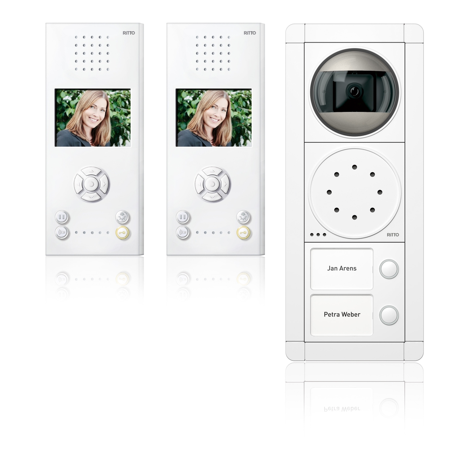 Video-Türsprechanlage im Komplettpaket. Portier Modul-Türstation in silber oder weiß. Rahmen AP 3-fach. Kameramodul Color mechanisch einstellbar (Gesamterfassungsbereich 150°). Türsprechmodul. Tastenmodul mit Klingeltaste und Namensschild (beleuchtet). 1 bzw. 2 Video-Freisprechstelle(en) Color RGE1787770, weiß. Brillante Color Bildwiedergabe (89 mm Display).