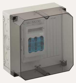 NH-Reiter-Sicherungs-Lasttrennschaltergehäuse, 1 x NH 00-Reiter-Sicherungs-Lasttrennschalter, Bemessungsstrom 125 A, Schellenanschluss 1,5-70mm², Abgang universal, auf Sammelschiene 5-polig, mit 5 Sammelschienenklemmen 16-70mm², N-Klemme 4-35mm², PE-Klemme 4-35mm², mit Isolierstopfen, auf Sammelschienensystem 250 A, mit transparentem Deckel
