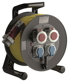 Spezialgummi-Kabeltrommel mit 2 CEE-Steckdosen 4-polig + E, 16A, 400V und 2 Maschinensteckdosen 2-polig + E, 16A, 250V Steckdosen sind jeweils druckwasserdicht inklusive druckwasserdichtem Stecker am Kabelende mit 33m Kabel H07BQ-F 5x2,5 Kabelfarbe gelb (auf Wunsch individueller Aufdruck ohne Aufpreis)